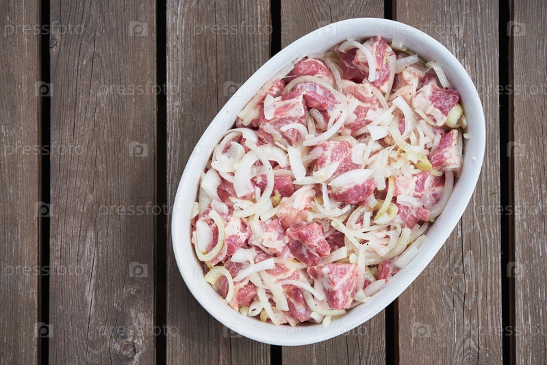 Маринованное мясо с луковыми кольцами на темном деревянном фоне с копией пространства, вид сверху в глубокой белой кастрюле