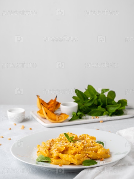 Пенне из тыквенных макарон с густым сливочным соусом из запеченной тыквы и пармезана, вид сбоку, вертикальный