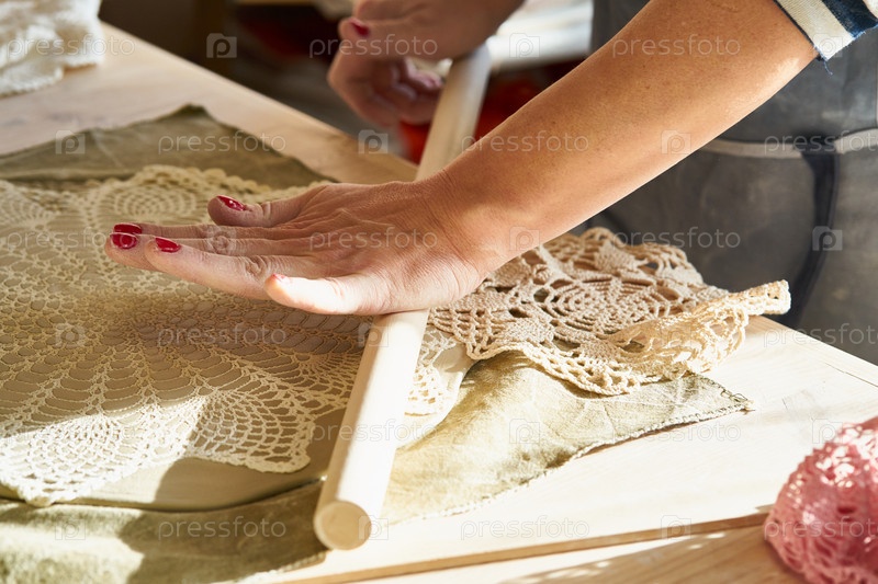 Женщина делает узор на керамической тарелке, руки крупным планом, фокусируются на ладонях с глиной