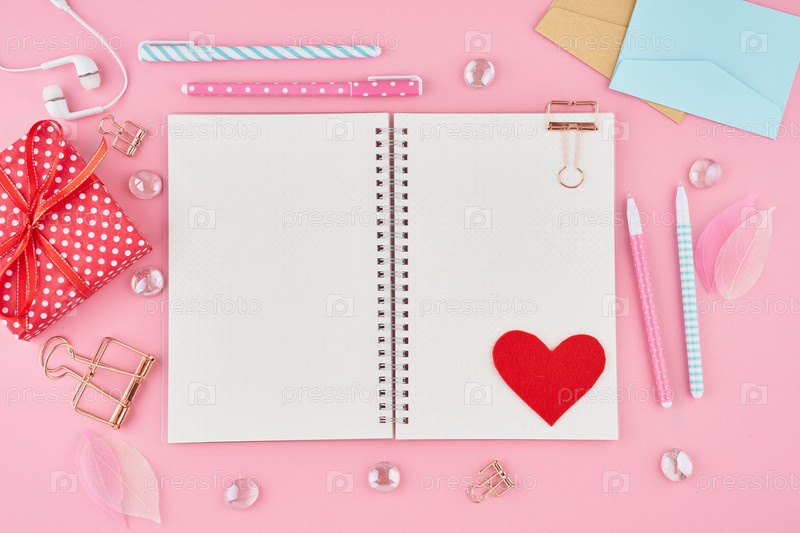 Концепция написания заметок, писем ко Дню святого Валентина. Пустая страница блокнота в журнале пуль на ярко-розовом офисном рабочем столе. Вид сверху современного стола с ноутбуком. Макет, копирование пространства