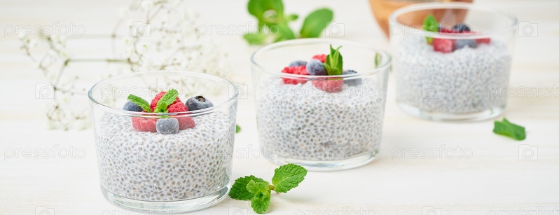 Длинный баннер с чиа-пудингом со свежими ягодами, малиной, черникой. Три стекла, светлый деревянный фон, вид сбоку, диагональ, цветы