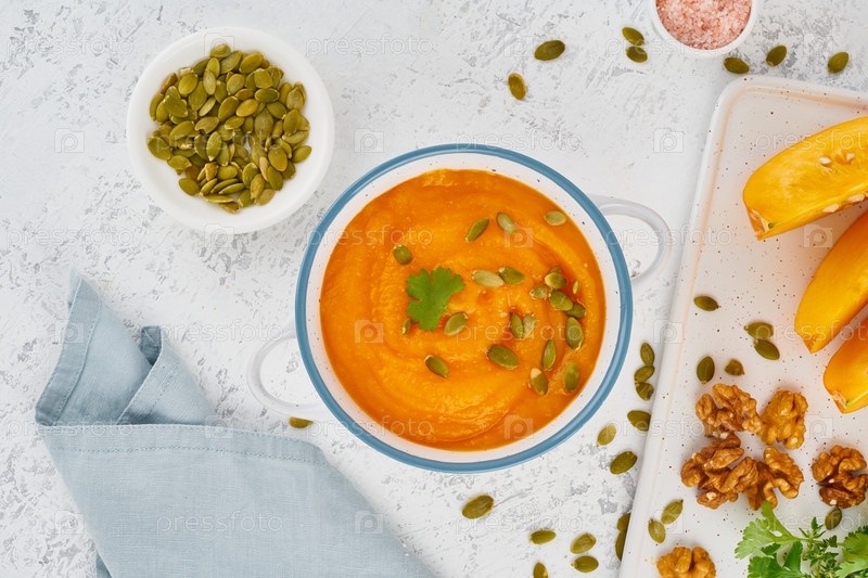 Здоровое питание для вегетарианцев, крем-суп с грецкими орехами и тыквенными семечками