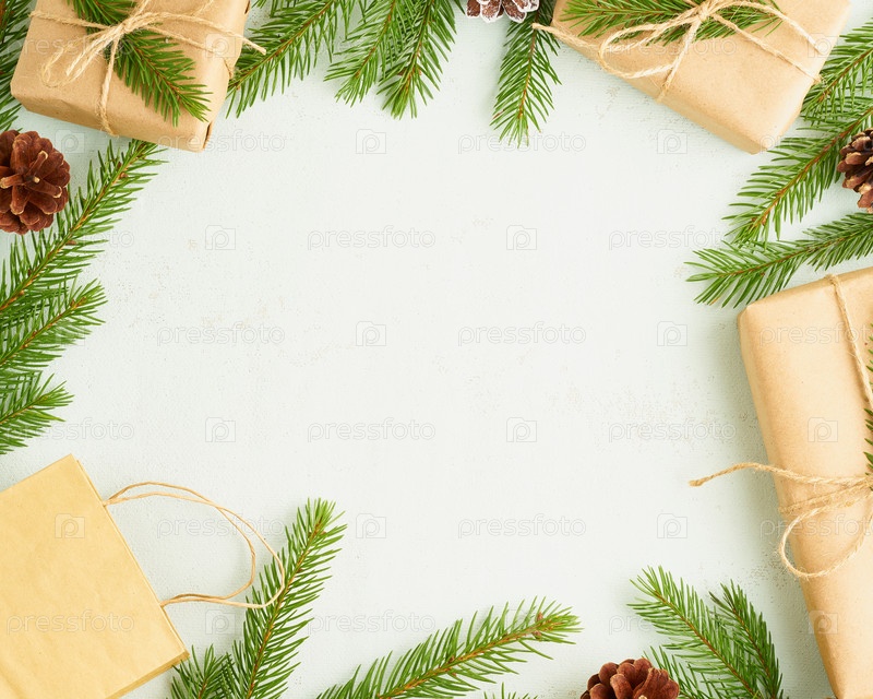 Рождество и счастливый Новый год. Деревянный фон без отходов. Подарочная рождественская коробка ручной работы, еловые ветки, крафт-бумага, вид сверху, пространство для копирования. Концепция экологически чистого пластика