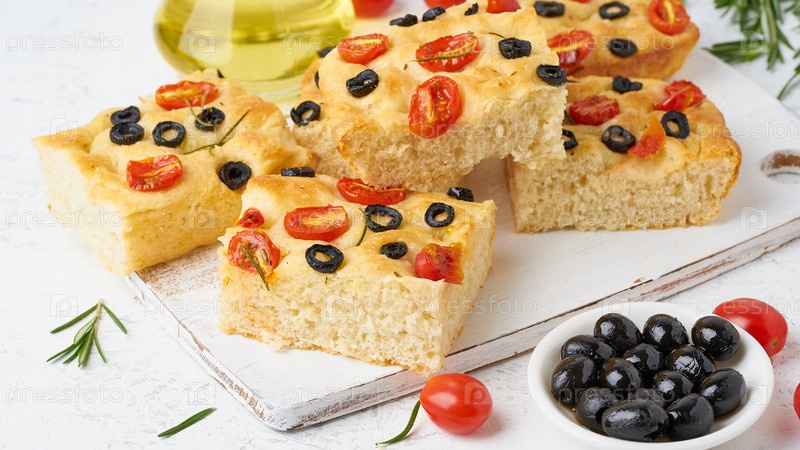 Фокачча с помидорами, оливками и розмарином, вид сбоку, крупным планом. Традиционная итальянская лепешка