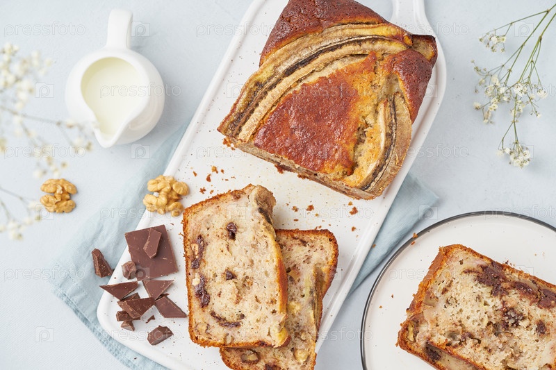 Банановый хлеб. Нарезанный торт с бананом, шоколадом, грецким орехом. Традиционная американская кухня, завтрак с кофе. Вид сверху