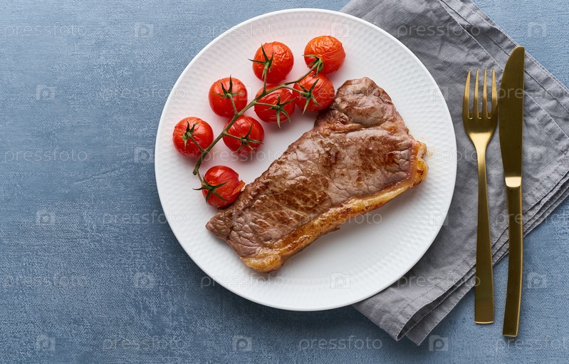 Кето-кетогенный диетический стейк с помидорами на темном фоне, вид сверху, место для копирования