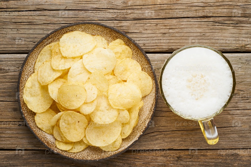 Хрустящая корочка в миске с пивом в стакане, вид сверху, деревянный фон
