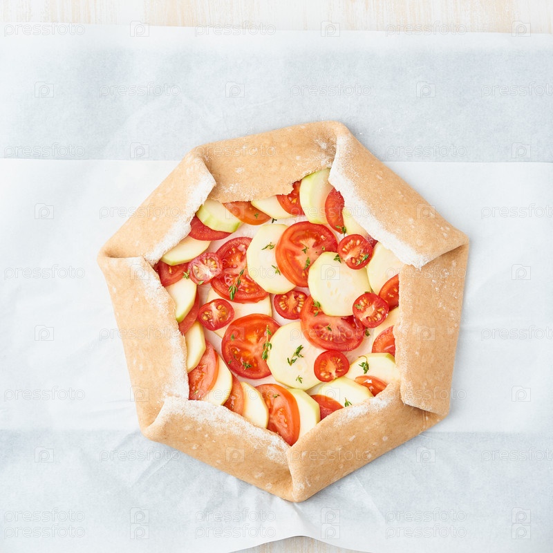 Пошаговый рецепт. Сырая домашняя галета с овощами. Вид сверху, белый деревянный стол