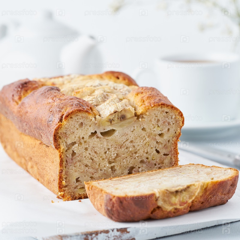 Банановый хлеб, кусок торта с бананом, вид сбоку, крупный план. Утренний завтрак на светло-сером фоне