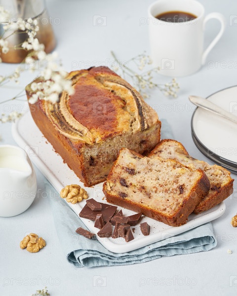 Банановый хлеб. Нарезанный торт с бананом, шоколадом, грецким орехом. Традиционная американская кухня, завтрак с кофе. Вид сбоку, вертикальный