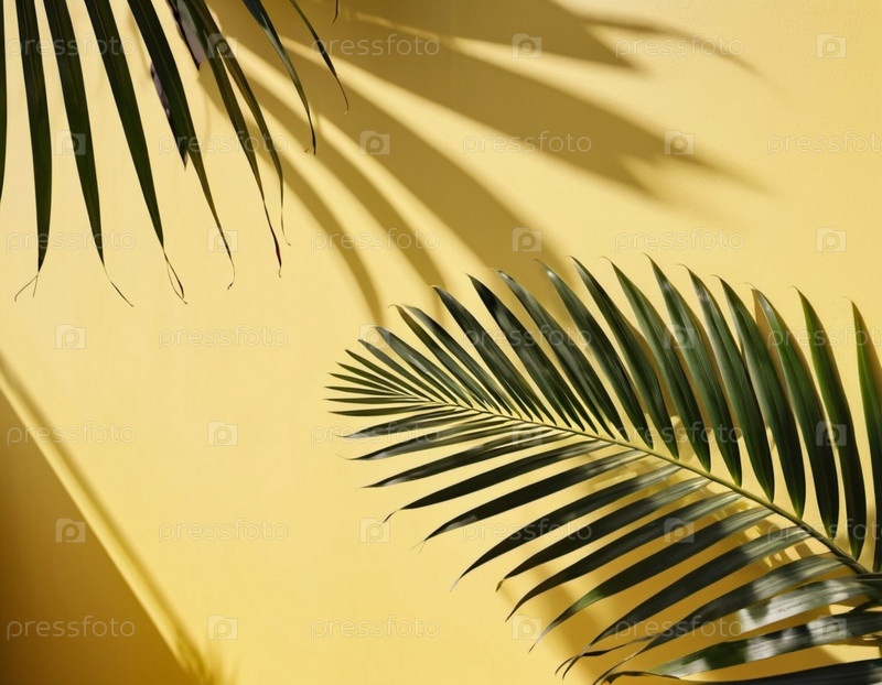 Размытая расфокусированная тень от пальмовых листьев на стене. Минималистичный красивый летний или весенний фон для презентации продукта. Тема путешествий и пляжного отдыха. Длинные узкие листья