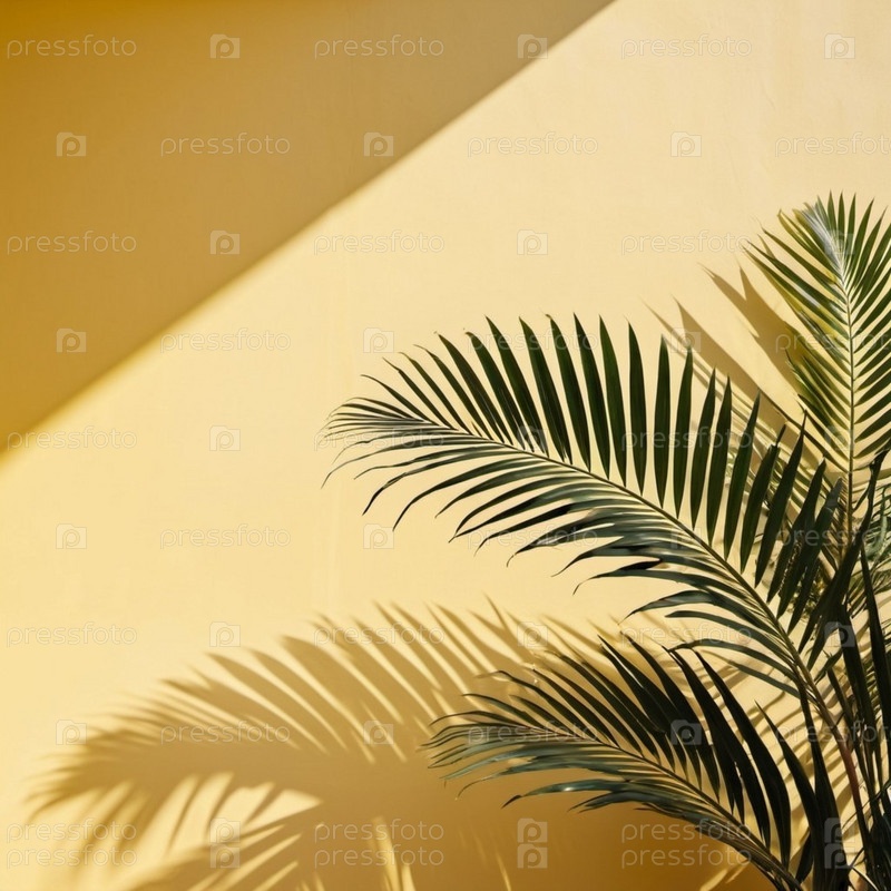 Размытая расфокусированная тень от пальмовых листьев на стене. Минималистичный красивый летний или весенний фон для презентации продукта. Тема путешествий и пляжного отдыха. Длинные узкие листья