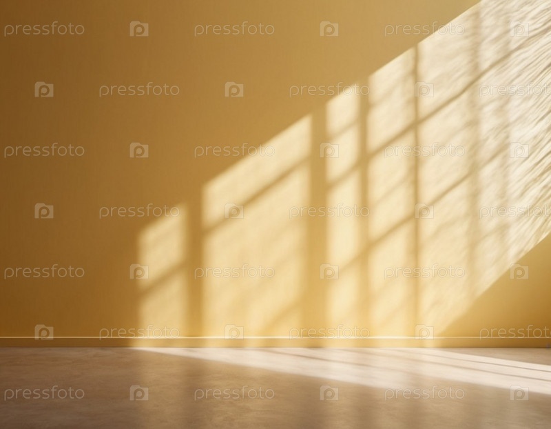 Желтая стена и большое окно. Солнечный свет струится через окно, отбрасывая длинные тени на стену. Комната светлая и просторная, чистая, в стиле минимализма