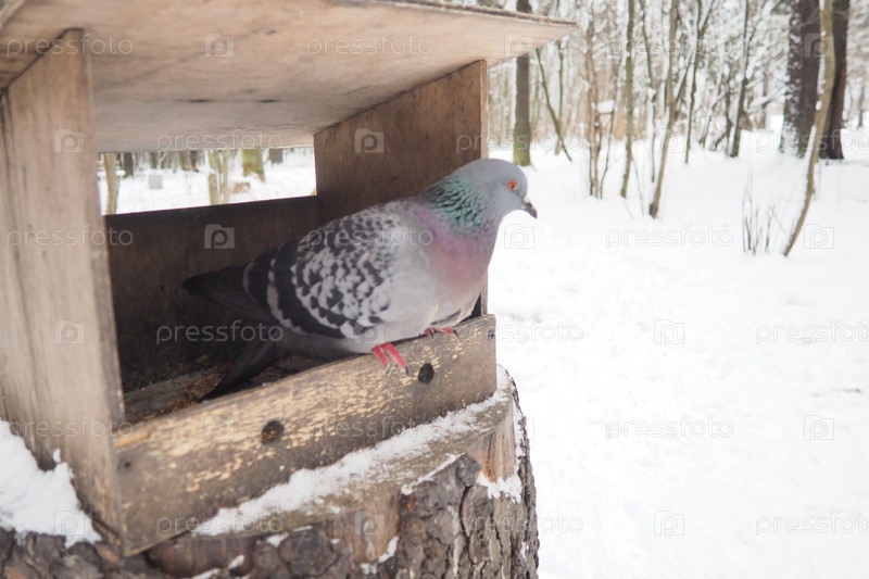 Подвесная самодельная кормушка или платформа для кормления птиц и белок зимой и весной в голодное время. Кормушки для птиц и белок в лесу или городском парке. Голубь ест