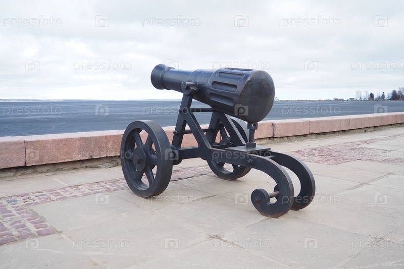 Петрозаводск, Карелия, Россия, 18 апреля 2024 года: набережная Онежского озера, декоративная чугунная пушка, смотрящая в сторону воды. Столица Карелии славилась Александровским пушечным заводом