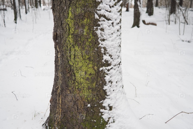 El Picea сосновое вечнозеленое дерево семейства Сосовых. Вечнозеленые деревья. Обыкновенная ёлка, или европейская пицея. Снег и мох на багажнике. Последствия снежных зимних бурь