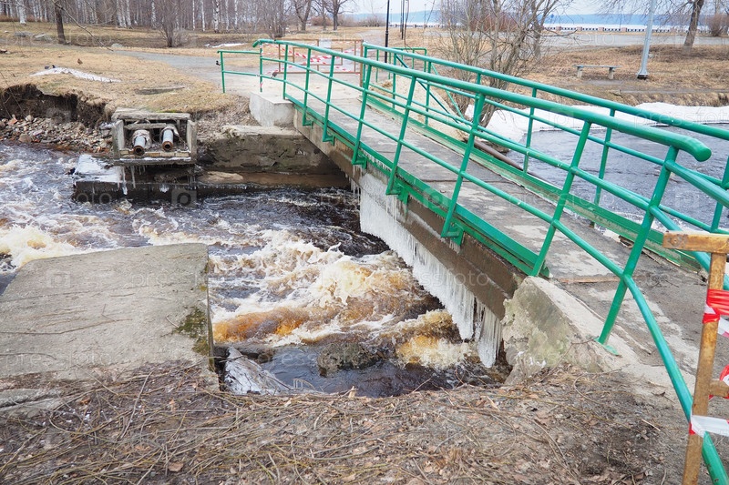 Весенний паводок. Бегущая вода в реке. Темная железистая вода несется в ручье. Карелия, река Лососинка весной. Наводнения, цунами и изменение климата. Разрушенный мост с трубами. Погодная катастрофа