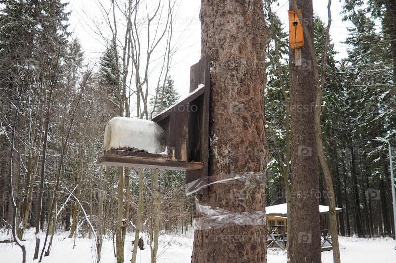 Подвесная самодельная кормушка или платформа для кормления птиц и белок зимой и весной в голодное время. Кормушки для птиц и белок в лесу или городском парке