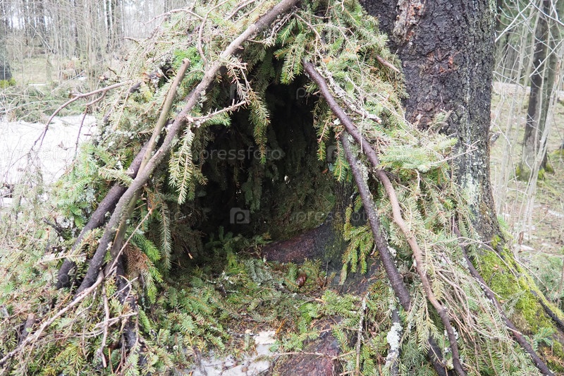 Хижина из еловых веток в карельском лесу. Шалаш – это простейшее легкое укрытие. Это конструкция, изготовленная по технологии плетения из шестов и палок, обтянутых ветками. Первое убежище