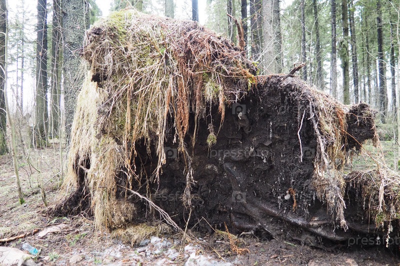 Picea abies, ель европейская или эль европейская. пихта крупное быстрорастущее вечнозеленое сосновое дерево. упавшая елка с корнями. ураганы наносят максимальный ущерб старым дубам. умирающий древесный лес