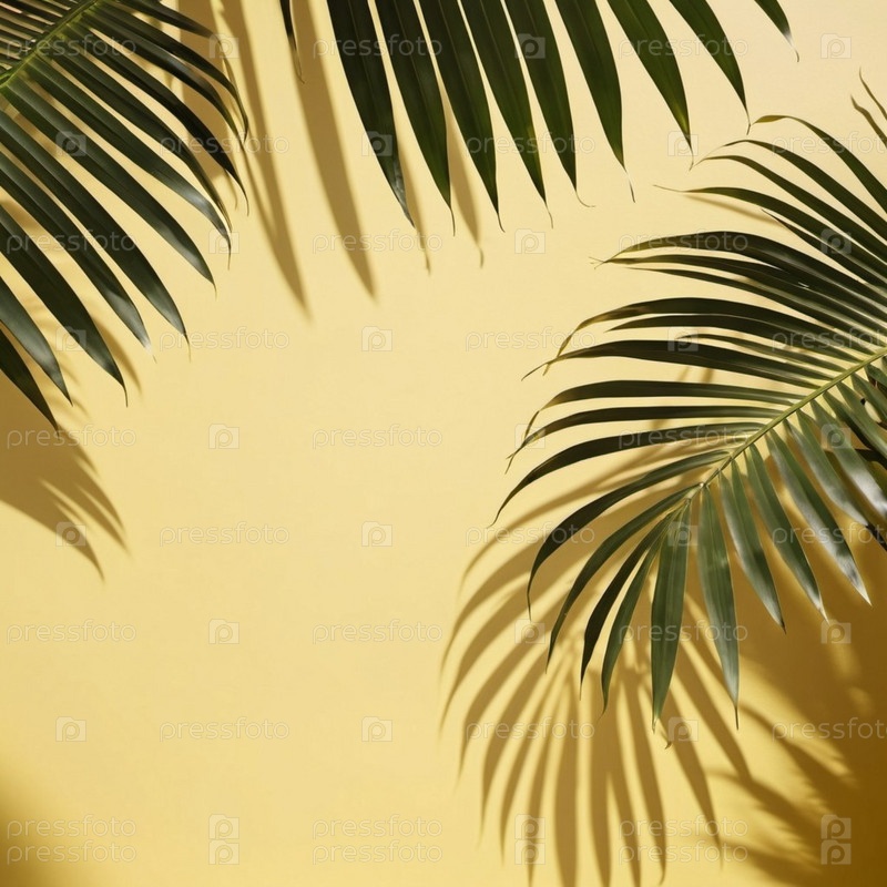 Размытая расфокусированная тень от пальмовых листьев на стене. Минималистичный красивый летний или весенний фон для презентации продукта. Тема путешествий и пляжного отдыха. Длинные узкие листья