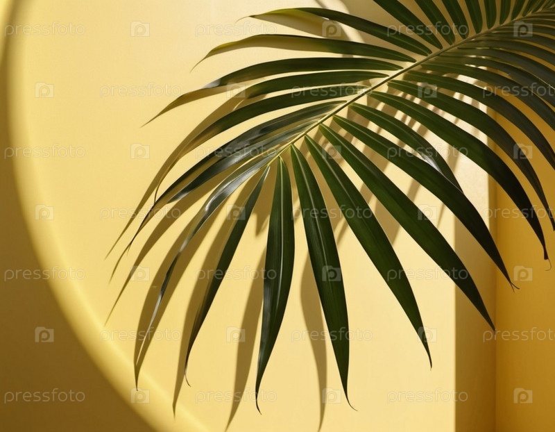 Размытая расфокусированная тень от пальмовых листьев на стене. Минималистичный красивый летний или весенний фон для презентации продукта. Тема путешествий и пляжного отдыха. Длинные узкие листья