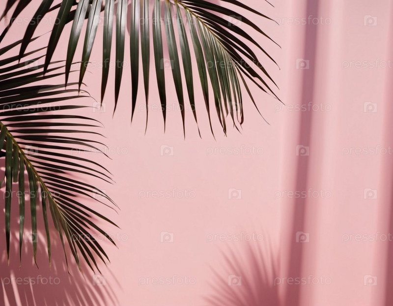Размытая расфокусированная тень от пальмовых листьев на стене. Минималистичный красивый летний или весенний фон для презентации продукта. Тема путешествий и пляжного отдыха. Длинные узкие листья