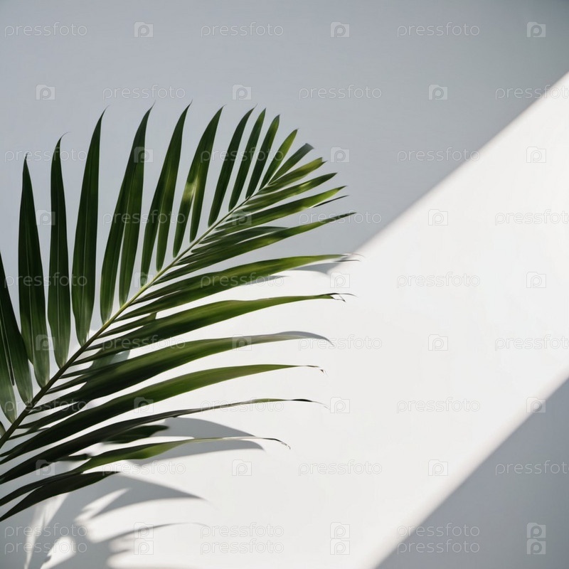 Размытая расфокусированная тень от пальмовых листьев на стене. Минималистичный красивый летний или весенний фон для презентации продукта. Тема путешествий и пляжного отдыха. Длинные узкие листья