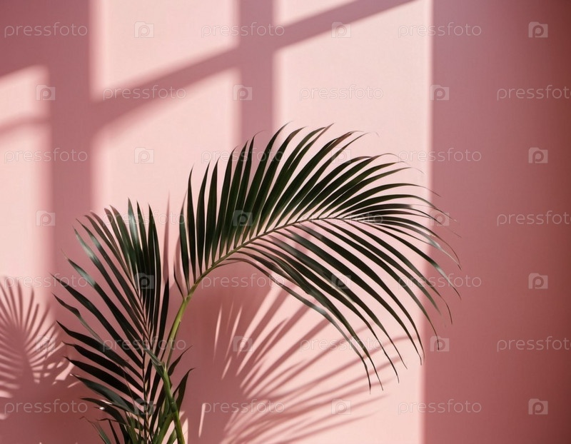 Размытая расфокусированная тень от пальмовых листьев на стене. Минималистичный красивый летний или весенний фон для презентации продукта. Тема путешествий и пляжного отдыха. Длинные узкие листья