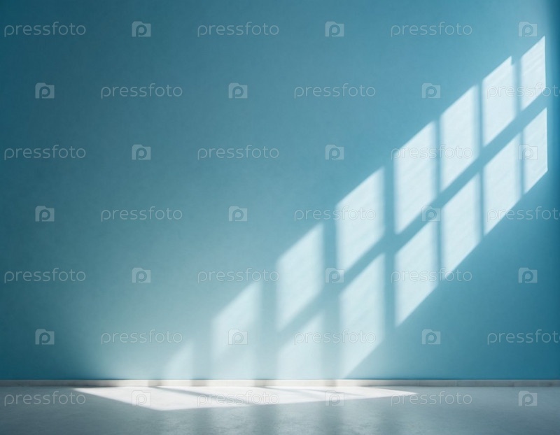 Синяя стена и большое окно. Солнечный свет струится через окно, отбрасывая длинные тени на стену. Комната светлая и просторная, чистая, в стиле минимализма. Фон для интерьера или демонстрации продукта