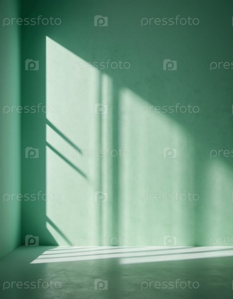 Зеленая стена и большое окно. Солнечный свет струится через окно, отбрасывая длинные тени на стену. Комната светлая и просторная, чистая, в стиле минимализма. Фон для интерьера или деИИ