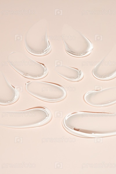 Текстура глицеринового геля. Прозрачные капли сыворотки на бежевом фоне. Жидкий гель-увлажняющий крем с пузырьками макроса