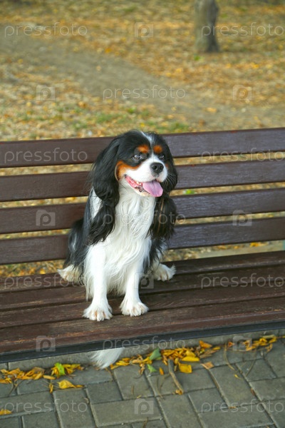 Маленькая собака сидит на лавочке. Любимый питомец