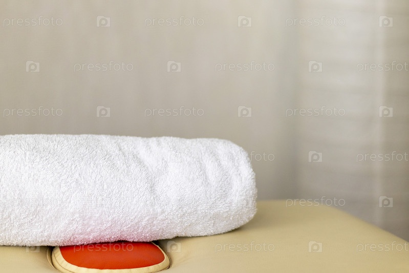 Крупный план белых полотенец, свернутых на массажной кушетке. Терапия