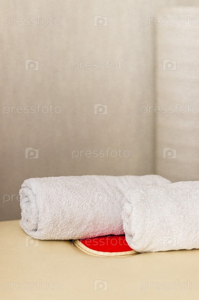 Крупный план белых полотенец, свернутых на массажной кушетке. Терапия