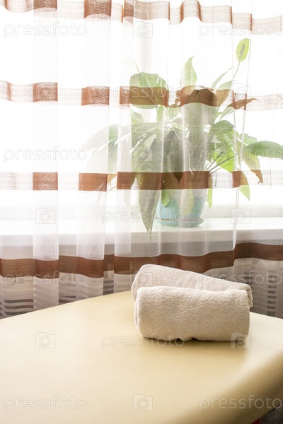Крупный план белых полотенец, свернутых на массажной кушетке. Терапия