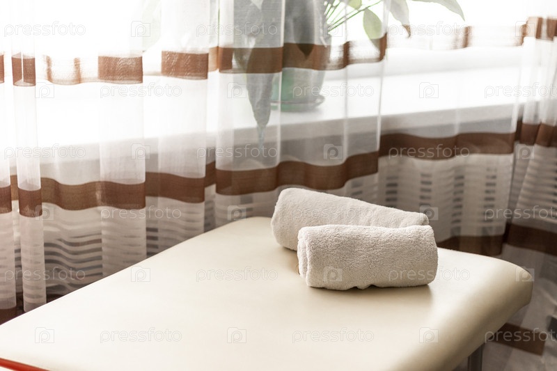 Крупный план белых полотенец, свернутых на массажной кушетке. Терапия