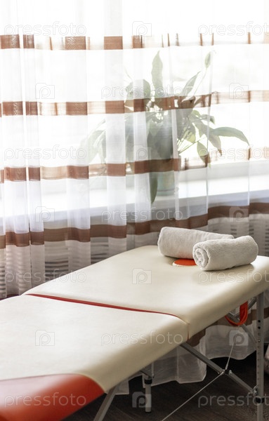 Крупный план белых полотенец, свернутых на массажной кушетке. Терапия