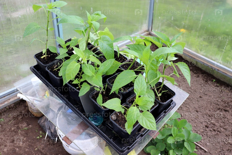 Рассада перца - молодые растения в горшках на столе в теплице