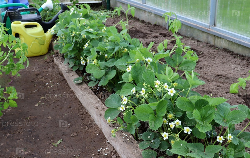 Цветущие кусты клубники и лейки с водой в теплице
