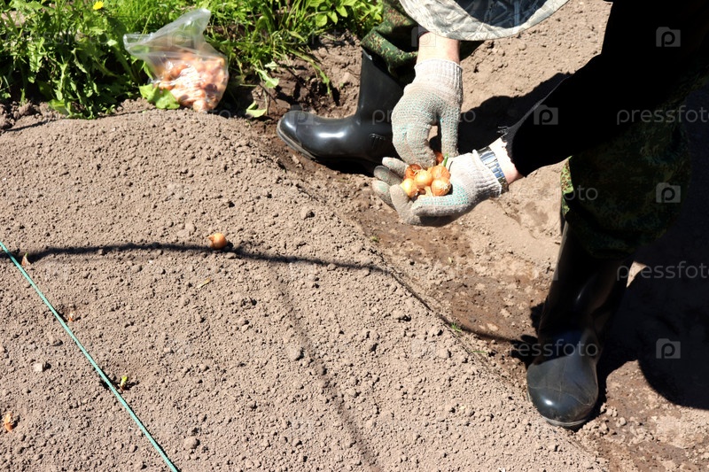 Фермер держит в руках луковицы и готовится к посадке, руки и ноги, крупный план