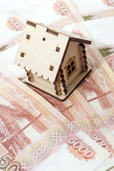 Деревянный дом с большим количеством купюр номиналом пяты тысяч. Покупка или продажа недвижимости. Оформление ипотеки