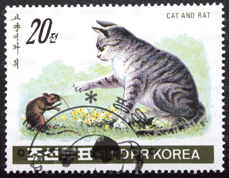 Почтовая марка с выпуском Северная Корея 1991 год Домашняя кошка (Felis silvestris catus) и крыса