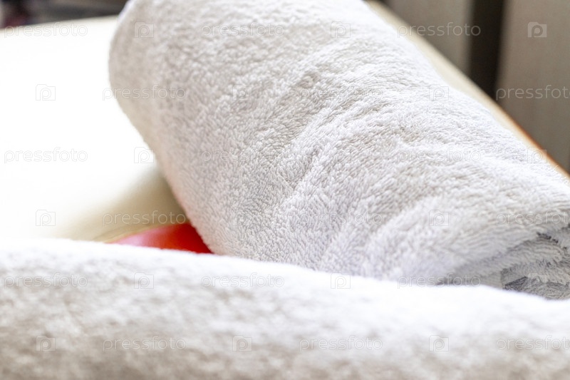 Крупный план белых полотенец, свернутых на массажной кушетке. Терапия