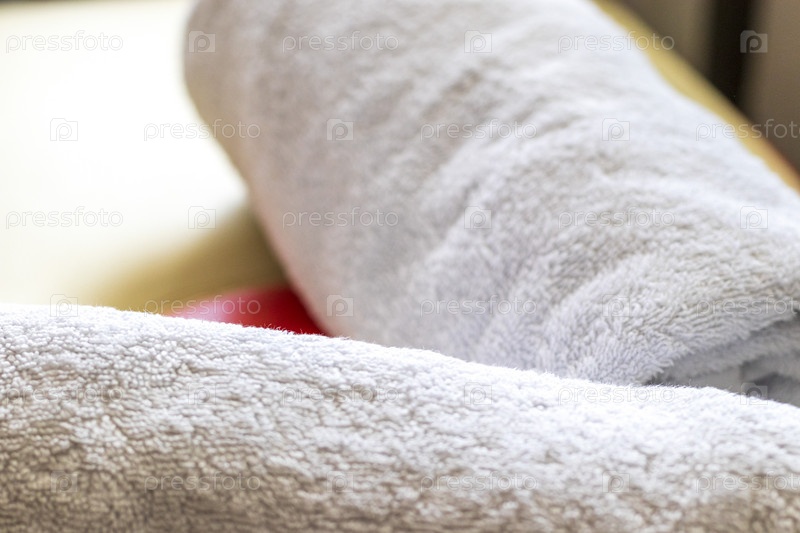 Крупный план белых полотенец, свернутых на массажной кушетке. Терапия