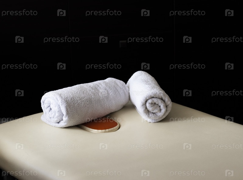 Крупный план белых полотенец, свернутых на массажной кушетке. Терапия