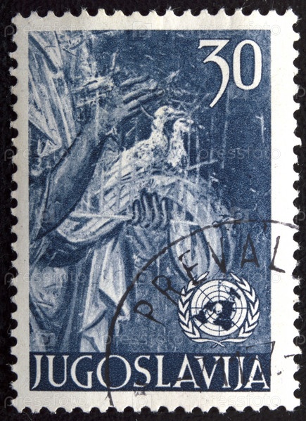 Почтовая марка с гашением Югославия 1953 год. Два голубя; фреска в церкви Нерези в Скопье