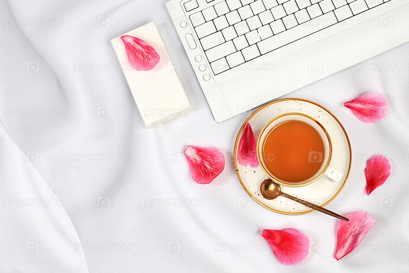 Современный женский стол, домашний офис. Компьютер, смартфон, лепестки роз и чашка чая на солнечном столе с длинными тенями, концепция образа жизни, удобная работа на дому, шаблон для дизайна, плоская планировка,