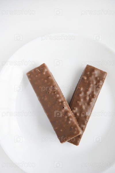 Сладкий шоколад на белой тарелке. Вафельный шоколад на белом фоне