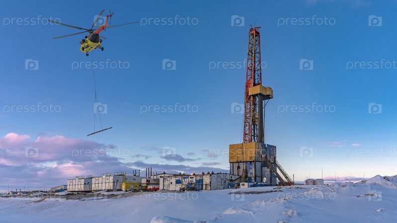 Коллаж. Желтый вертолет на переднем плане. Инфраструктура буровой установки на арктическом нефтегазовом месторождении на заднем плане